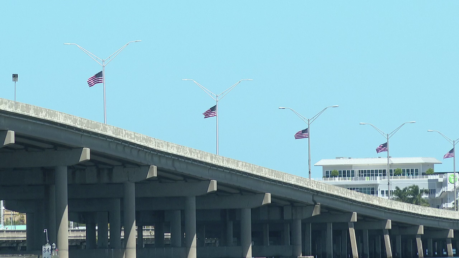 The flags are scheduled to remain in place through the Fourth of July, though both Mayor West of Palmetto and Mayor Gene Brown of Bradenton are hopeful they can stay flying even longer with permission from the Florida Department of Transportation.