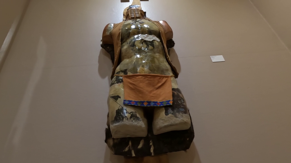 Kathy Barsotti's piece is a love letter to Native American culture. It features century-old barnwood, a mannequin and pieces of a cow-skin rug.