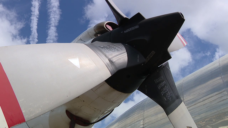 Elliott explained, "It started life as a KC-97 Stratofreighter, which was the Air Force’s first in-flight refueling capability back at the end of World War II. This particular airplane, the hull, was built in 1953, and it flew about 2,000 hours as a KC-97. It has a 707 landing gear on the front that’s turned 180 degrees out, has parts of a B-29 wing to extend the original wings out for the propellers. Propellers are off a C-130 and the nacelles and engines are off a P-3. So a lot of parts on there from different aircraft for sure. Oh, and the other interesting thing is that the struts that actually hold the airplane up when we open it up are from a dump truck. They got very creative."