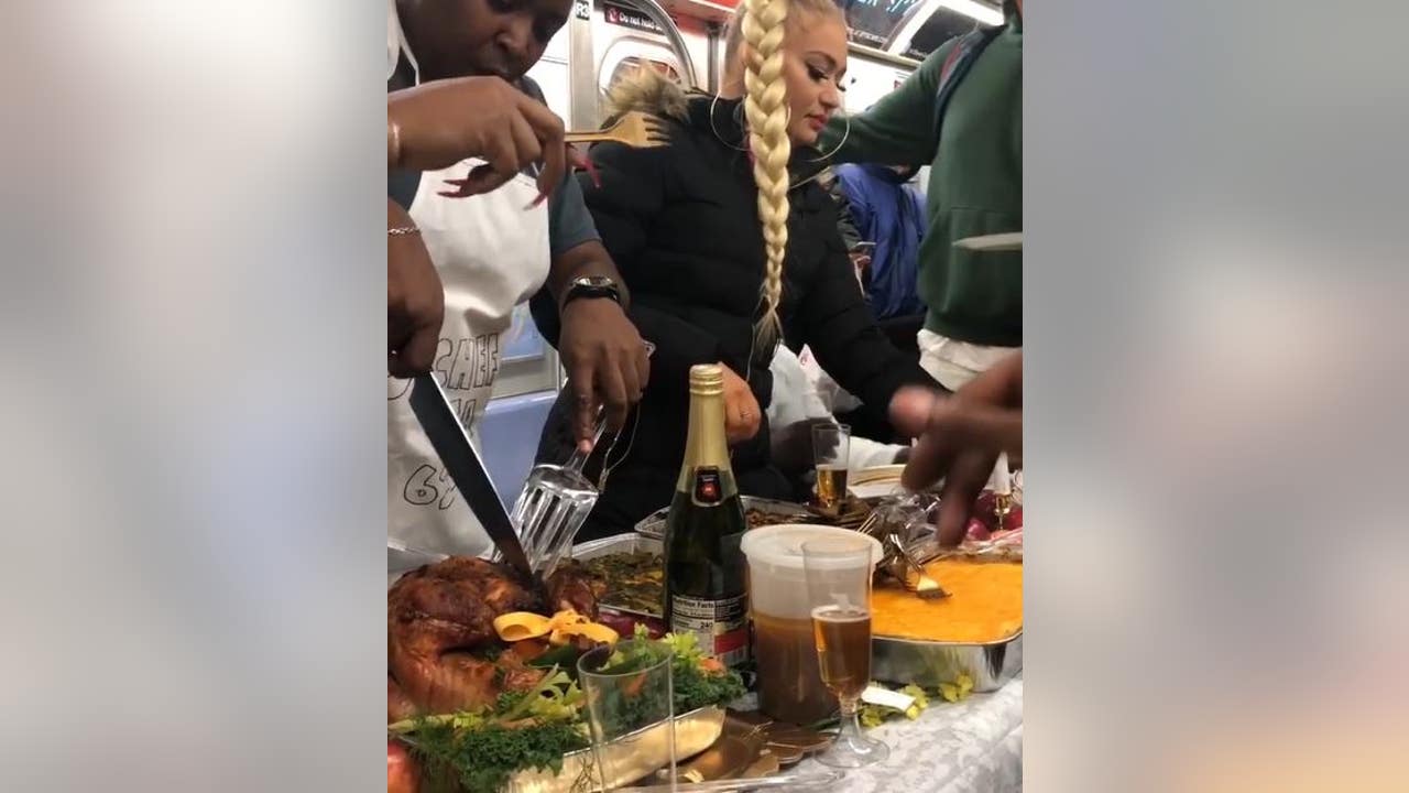 Passengers on a New York subway held a Thanksgiving feast complete with a table full of turkey, sides, non-alcoholic bubbly, and electric candles.
