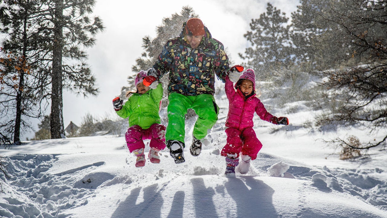 FILE - A father and hi two daughters frolicking in the fresh snow off Highway 2 on March 11, 2021 in Wrightwood, California.