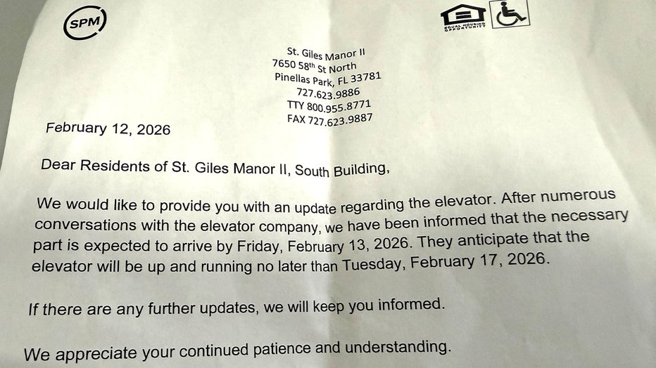 FOX 13’s Blake DeVine reached out to a representative on behalf of SPM Property Management. That employee said a technician was working on the elevator and said it will be repaired by Wednesday. Until it’s fixed, several seniors remain unable to leave the building.