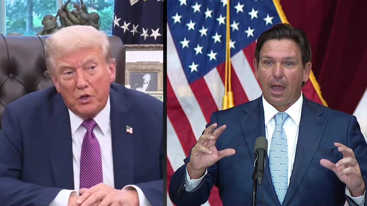 President Donald Trump is pushing back on Gov. Ron DeSantis' push to end all vaccine mandates in Florida. Evan Axelbank reports.