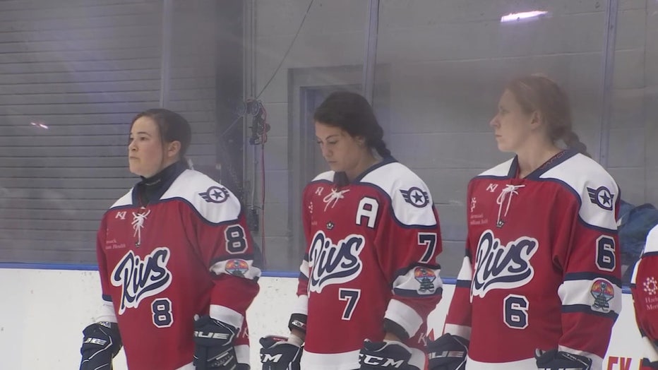 Groups of youth hockey players surrounded the boards and cheered during the game between the Riveters and Minnesota Whitecaps.