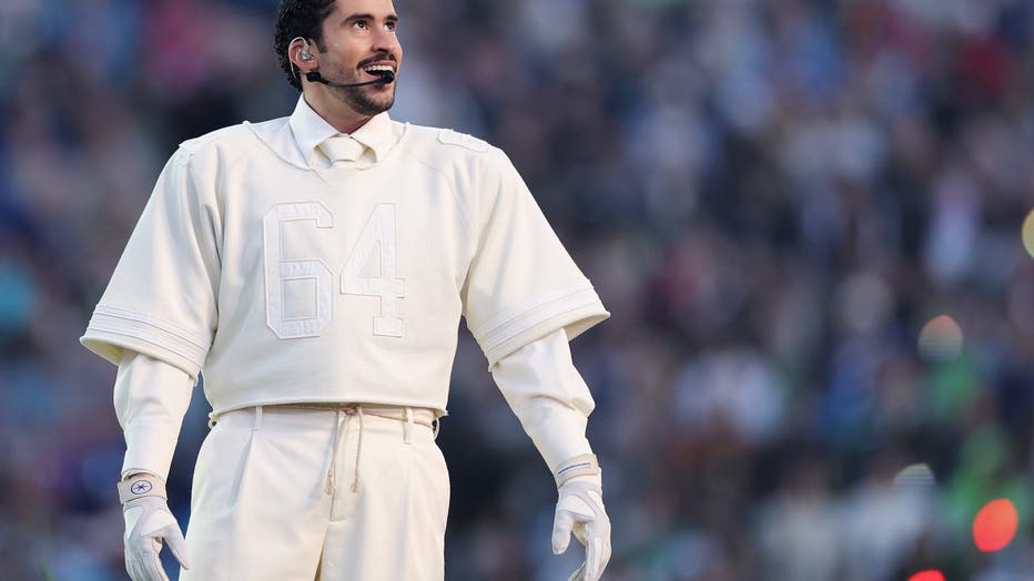 SANTA CLARA, CALIFORNIA - FEBRUARY 08: Bad Bunny performs onstage during the Apple Music Super Bowl LX Halftime Show at Levi's Stadium on February 08, 2026 in Santa Clara, California. (Photo by Kevin C. Cox/Getty Images)