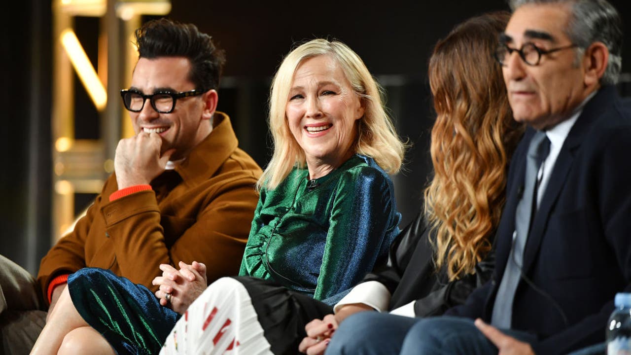 PASADENA, CALIFORNIA - JANUARY 13: (L-R) Daniel Levy, Catherine O'Hara, Annie Murphy and Eugene Levy of "Schitt's Creek" speak during the Pop TV segment of the 2020 Winter TCA Press Tour at The Langham Huntington, Pasadena on January 13, 2020 in Pasa