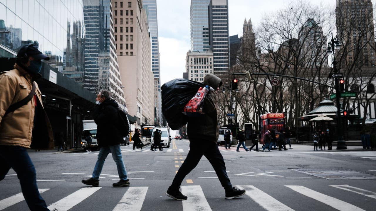 FILE - People walk through the streets of Manhattan on March 1, 2021 in New York City. (Photo by Spencer Platt/Getty Images)