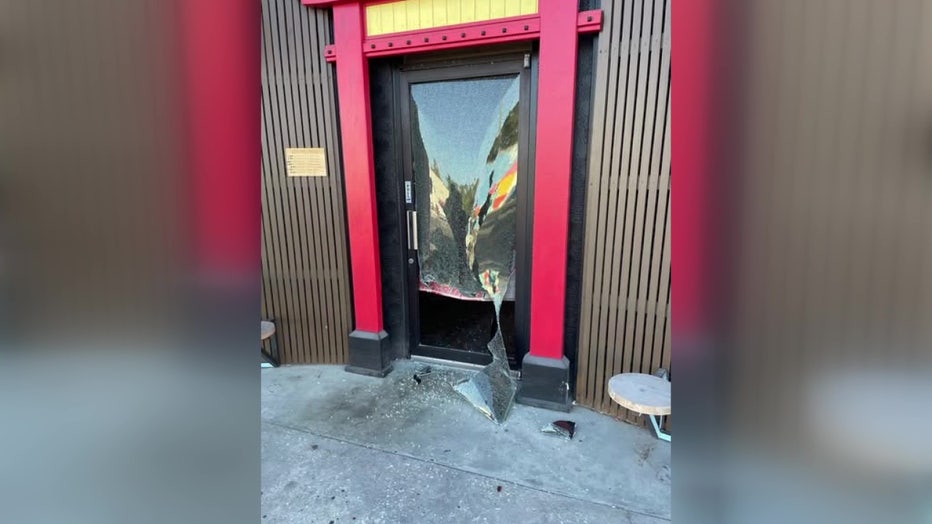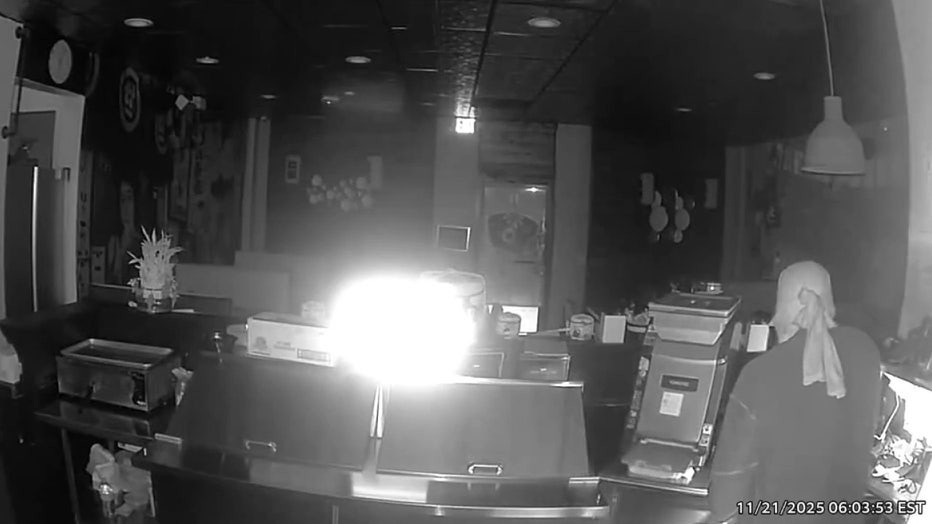 The bottom half of the front door had been shattered. The restaurant's security camera captured a masked person darting through the dark restaurant around 6 a.m. Friday, eventually making their way to the register.