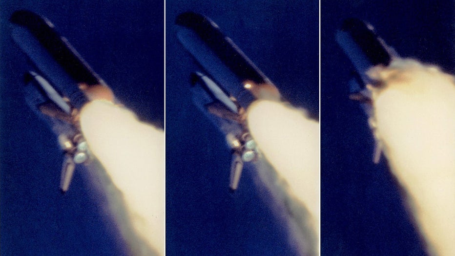 Sequential photos, released by NASA, show a fiery plume escaping from Challenger's right solid rocket booster and growing toward an explosion. (NASA/AFP via Getty Images)