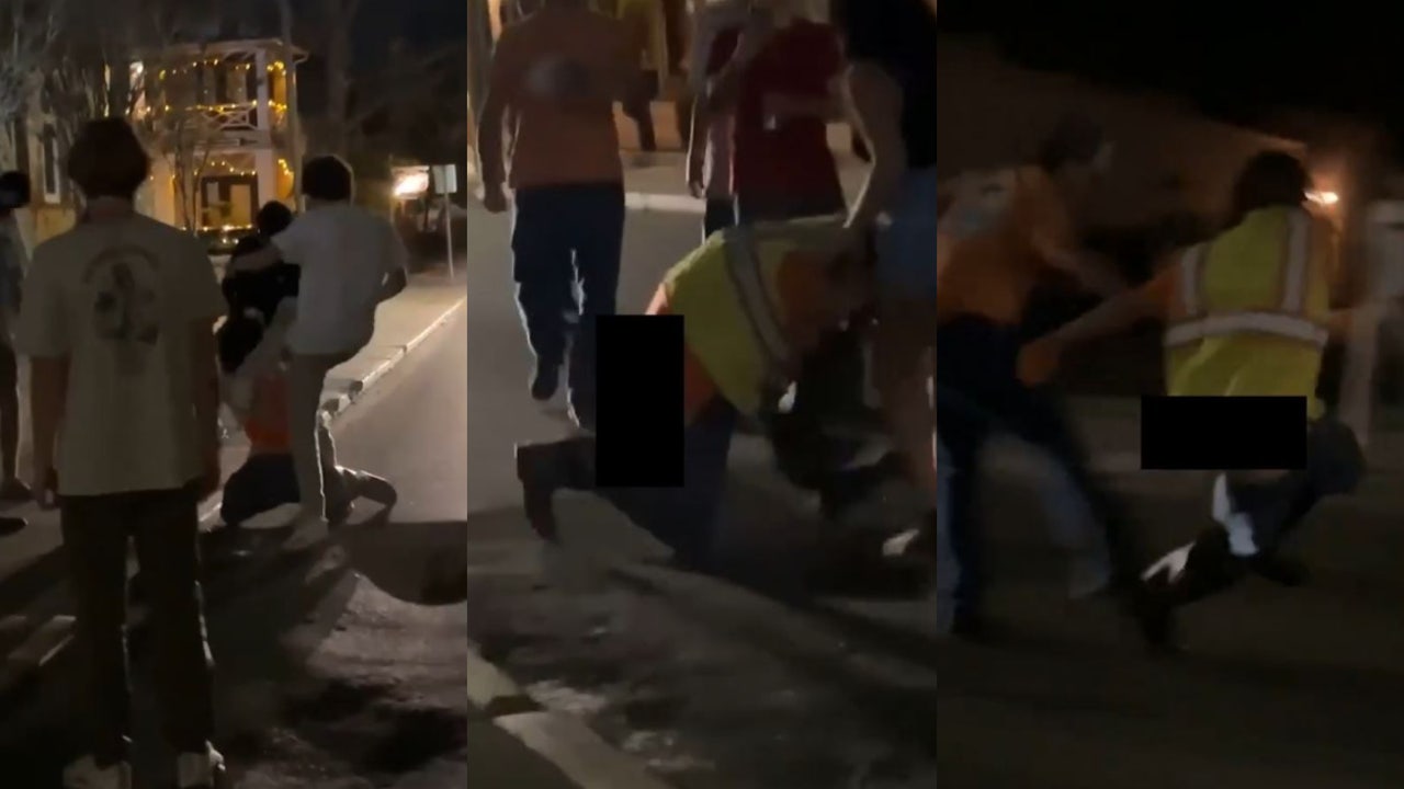 Police shared video of the fight on social media this week, which shows a group of young adult males ridiculing, kicking and punching a city worker who was wearing a yellow construction vest. There was a group of at least 10 people around the city worker, as seen in the video.