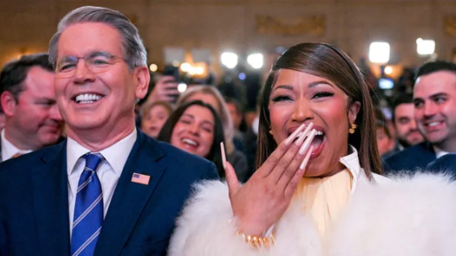Treasury Secretary Scott Bessent, left, and rapper and singer-songwriter Nicki Minaj listen as President Donald Trump delivers remarks on Trump Accounts in Washington, D.C., on Jan. 28. (Brendan Smialowski/AFP via Getty Images)