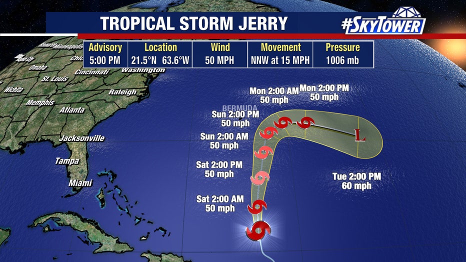 As of Friday afternoon, Tropical Storm Jerry's maximum sustained winds were 50 mph. The storm was located about 80 miles to the northeast of the northern Leeward Islands Friday morning and is moving off to the northwest at 15 mph.