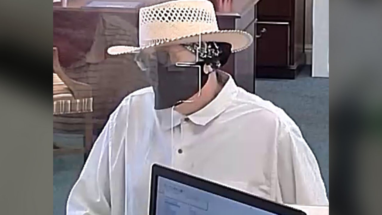 The suspect is described as a white male, wearing a long sleeve, button-up shirt, dark pants, a black bandanna on his head, covered by a straw hat, and a black face mask.
