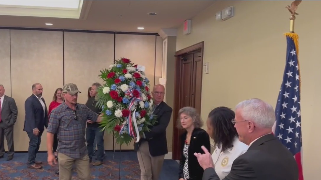 A wreath was laid indoors by the flag and later moved out to MacDill Park once the rain cleared.