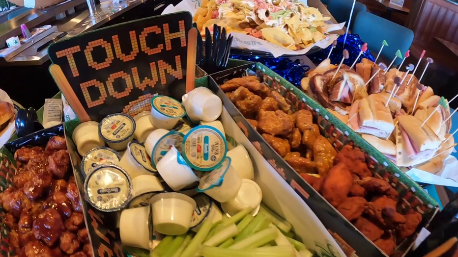 "We'll start off with some of these really cool platters we have," Aaron Carricato, the owner of the Beef O'Brady's in Seffner, said. "We bought these online, so you could have one of these touchdown wing platters at home. Getting ready for your football display, or of course, yours at home, can be absolutely simple. We bought this tablecloth, this awesome touchdown platter, a few of the other platters, along with each of these picks, all from (online)."