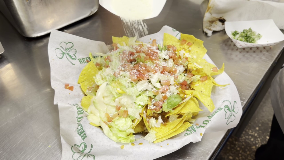 "As you guys know, people eat with their eyes," Carricato said. So creating a good-looking platter is as important as a great tasting one. Of course, nachos are a fan favorite for everybody, and it's absolutely simple. You're going to throw some chips down, and then you can choose what you want to put on top. We went with chili cheese on ours, but if you want to add some extra proteins, very simple, you go ahead, and you add chicken, you can add steak, you can add ground beef on top of those."