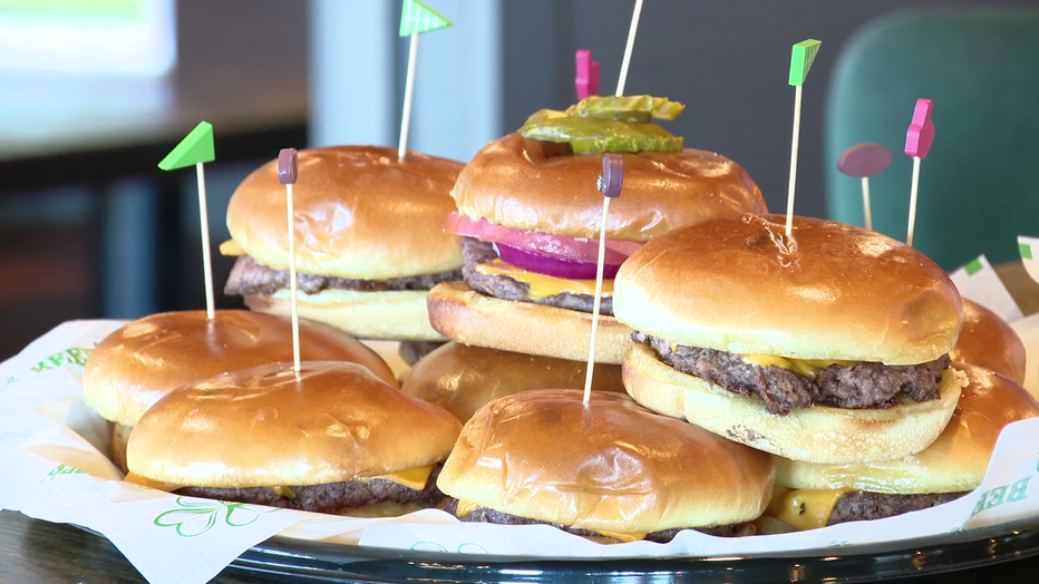 "Burgers, of course, is something you can do in your backyard or, once again, order them from Beef 'O' Brady's," Carricato said. "Make them look really cool with a little pick that goes in it, and then we put the condiments right here to make this a build-your-own burger bar. Once again, something you can very easily do at home and makes people feel like they're right there at the game or at the stadium doing so."