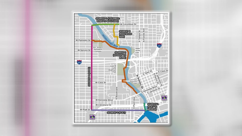 Segments three through six focus on road improvements on the west side of the Hillsborough River, creating a continuous loop with the existing Riverwalk and connecting downtown to Hyde Park, Old West Tampa, and Tampa Heights.