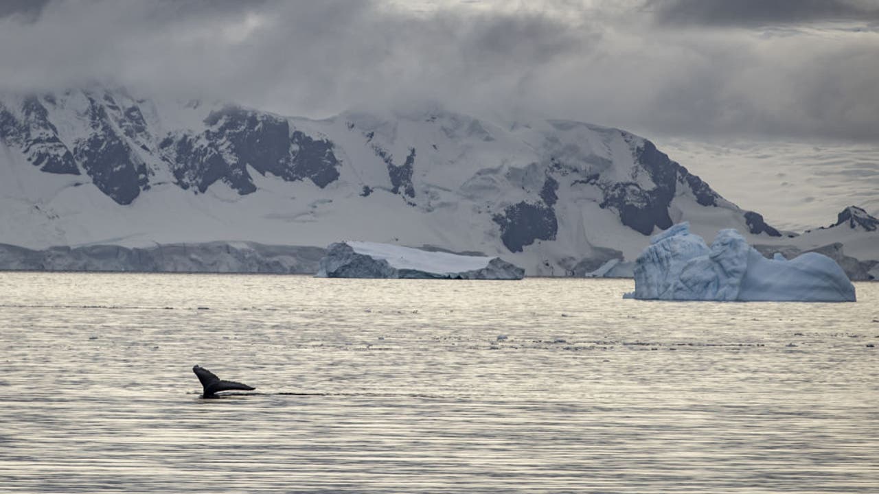A humpback whale is seen on the sea surface near Nansen Island in Antarctica on March 01, 2022.