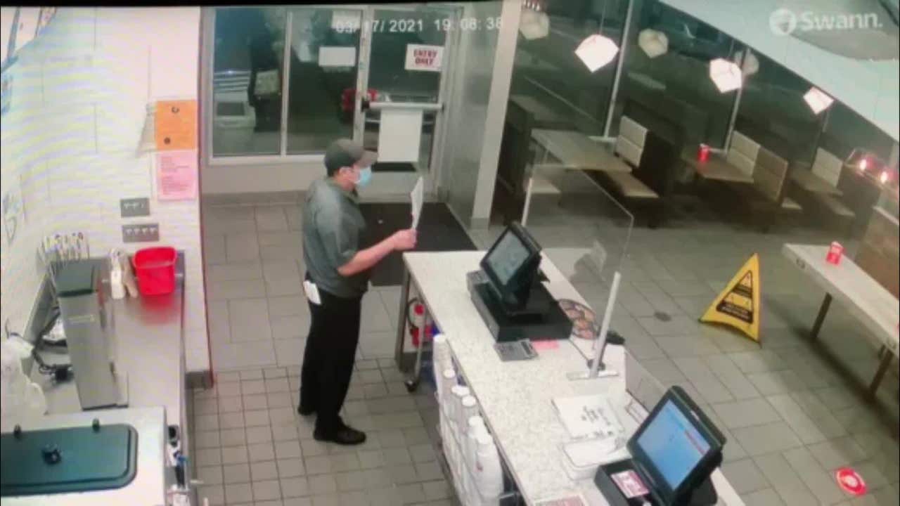 A man is suspected of stabbing an employee at a fast-food restaurant in the Houston metro area on March 17, after a confrontation over the restaurant’s mask policy. Video courtesy League City Police Department via Storyful.
