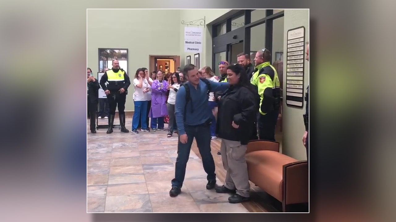AMARILLO, Tex. - An officer with the Amarillo Police Department was greeted by his colleagues after finishing his last chemotherapy treatment at a Texas hospital on January 22.