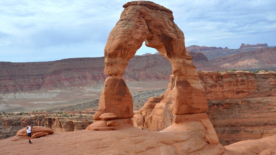 A visitor to Arches National Park near Moab, Utah, photographs the park's best known attraction, Delicate Arch. (Photo by Robert Alexander/Archive Photos/Getty Images)