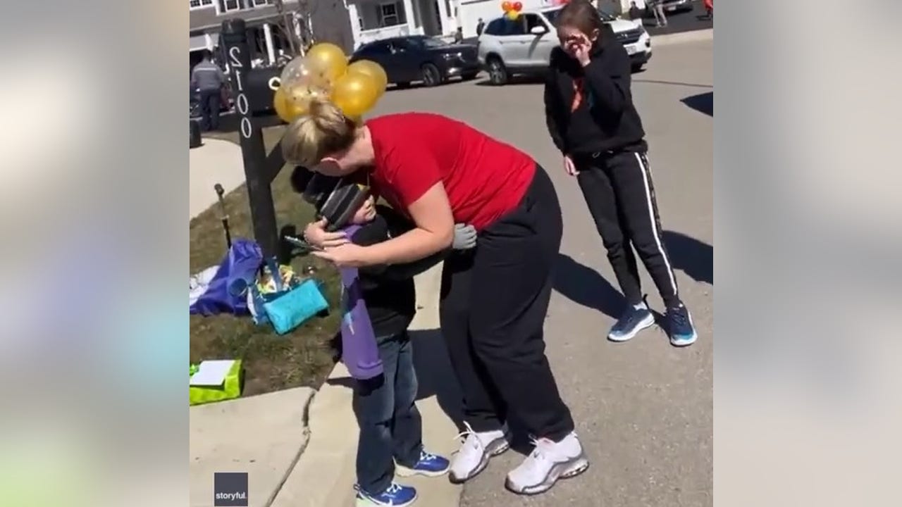 The 10-minute video showed Aiden standing on the sidewalk as drivers cruised down the street, handing him gifts through their vehicle windows. Several people also walked along the parade route, including a person dressed in a dinosaur costume.
