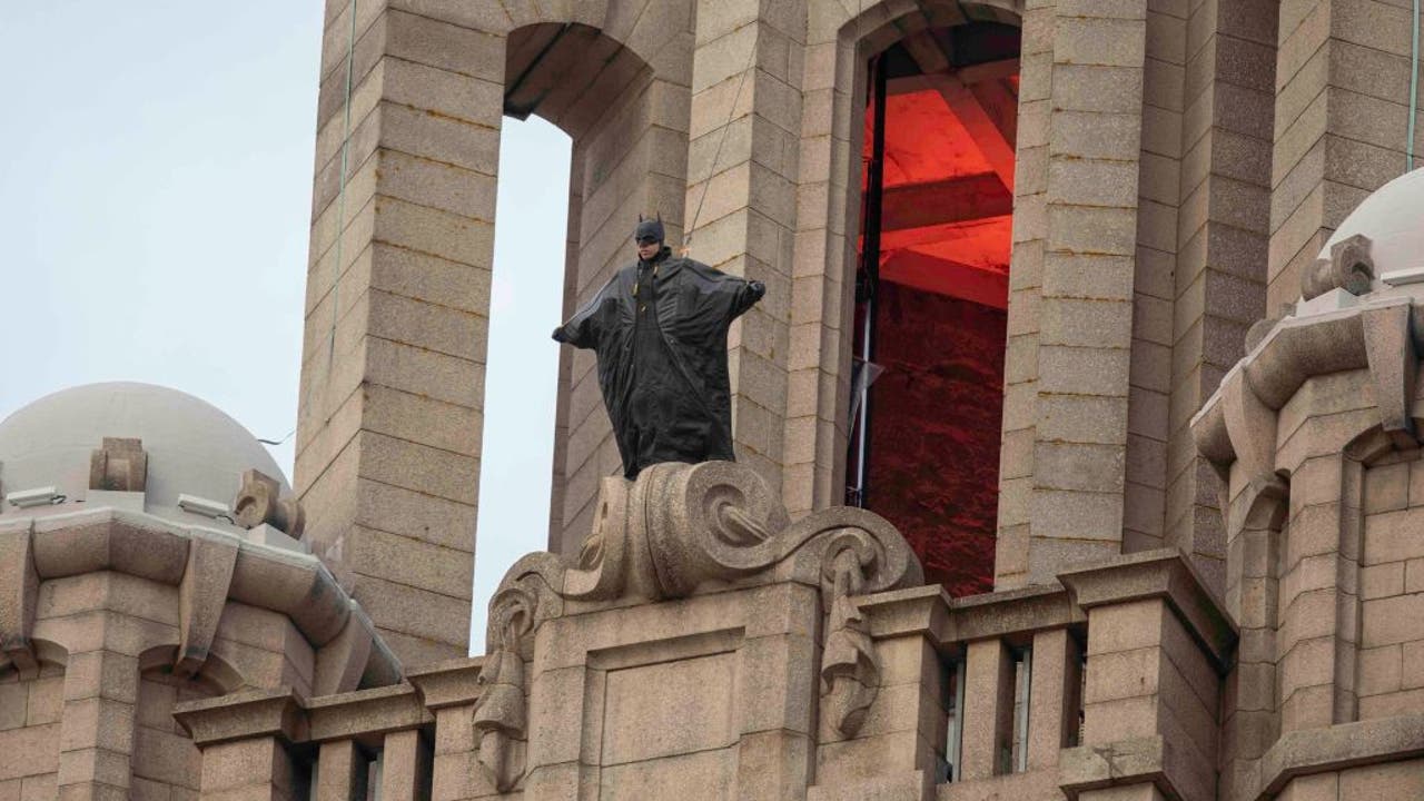 LIVERPOOL, ENGLAND - OCTOBER 15: Robert Pattinson's stuntman stand-in spotted on top of Liverpool's iconic Liver Building as they film scenes from a helicopter for The Batman on October 15, 2020 in Liverpool, England. (Photo by MEGA/GC Images)