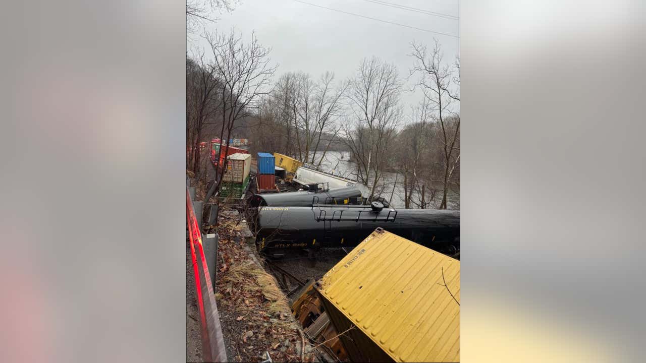 The Nancy Run Fire Company posted pictures showing a number of railroad cars scattered along the riverbank and at least one partially in the water.
