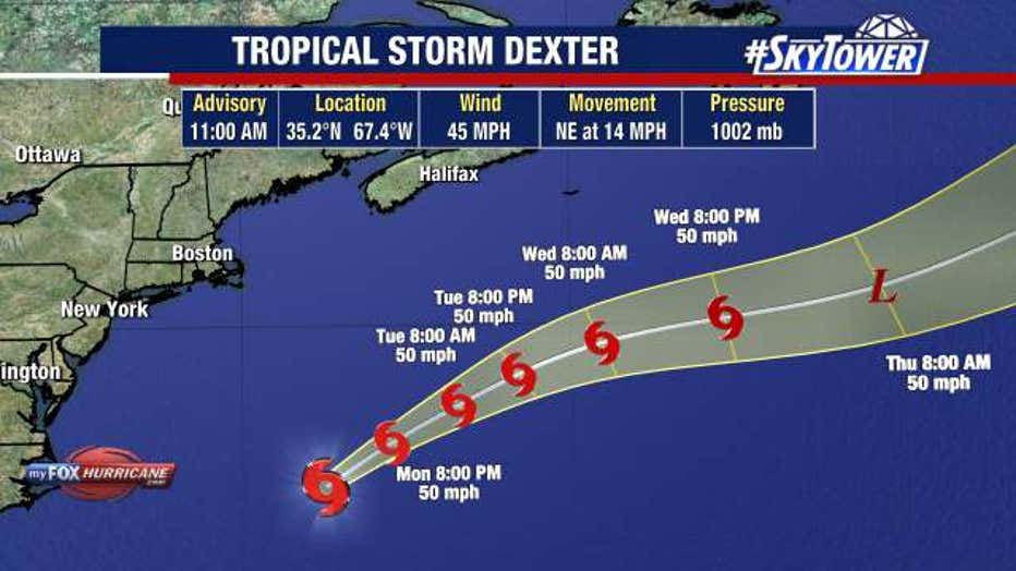 FOX 13 meteorologists say some strengthening is possible in the short term, but Dexter is expected to weaken and dissipate in the North Atlantic within the next week.
