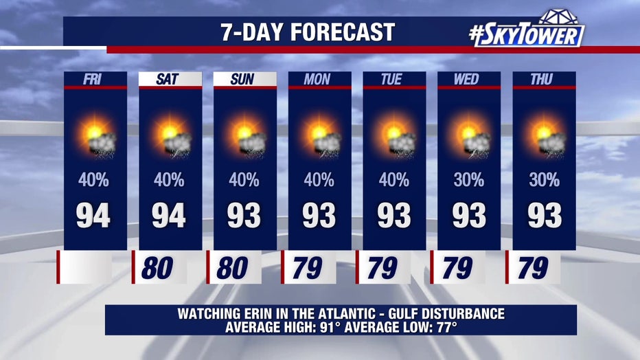 In the Bay Area, Friday will be partly cloudy with a few afternoon thunderstorms and a high of about 94 degrees in Tampa. It will be a similar setup through the weekend and into next week.