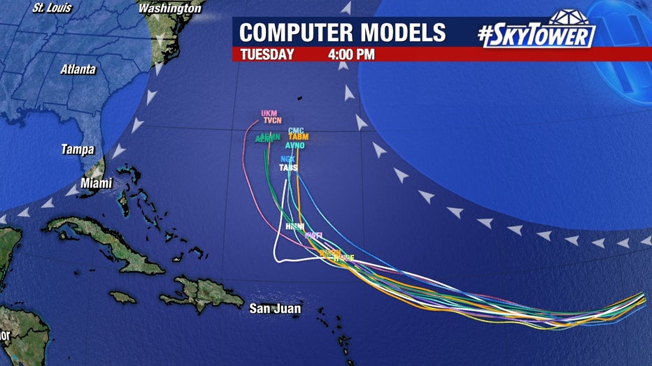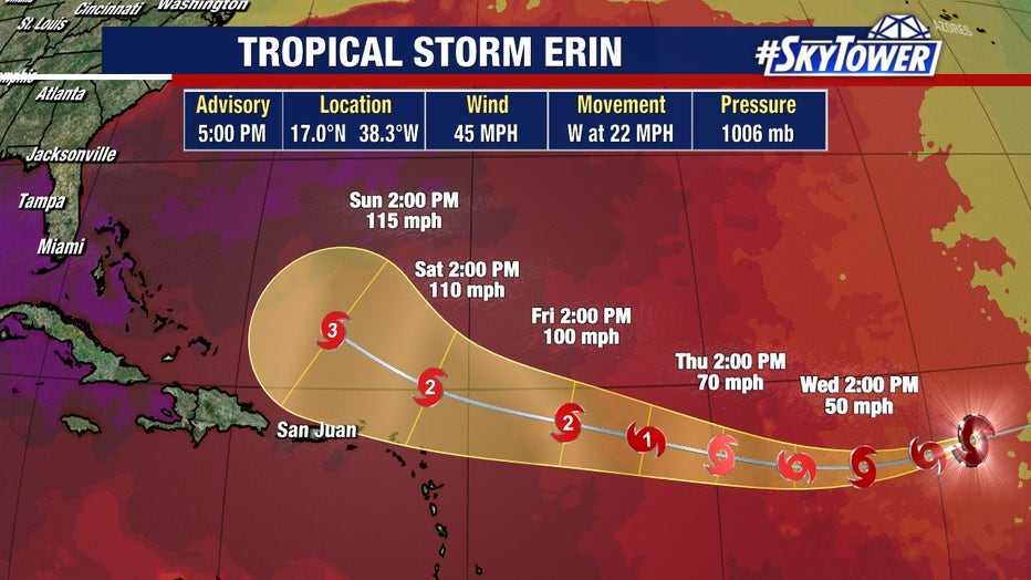 TAMPA, Fla. - The National Hurricane Center says Tropical Storm Erin is making its way west across the Atlantic Ocean – but with the storm still thousands of miles from the U.S. coast, FOX 13 meteorologists say it's still too soon to pinpoint its eventual path.