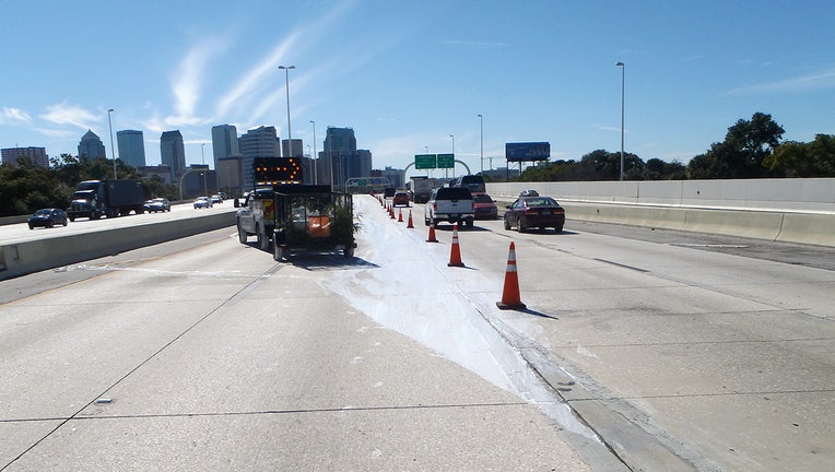 TAMPA, Fla. - Troopers say a truck spilled white paint across two lanes of Interstate 275 downtown this morning, forcing crews to close two lanes until it can be cleaned up.