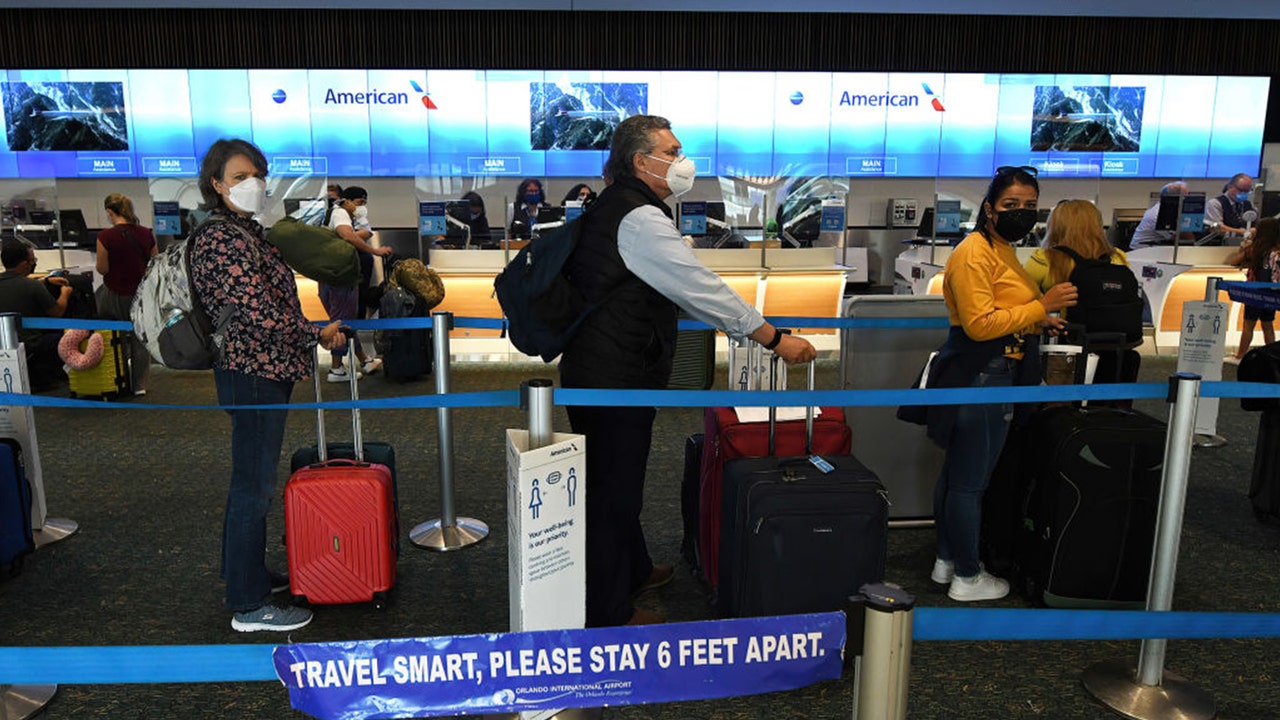 FILE - Travelers wearing face masks as a preventive measure against the spread of COVID-19 wait in line at the American Airlines ticket counter at Orlando International Airport.