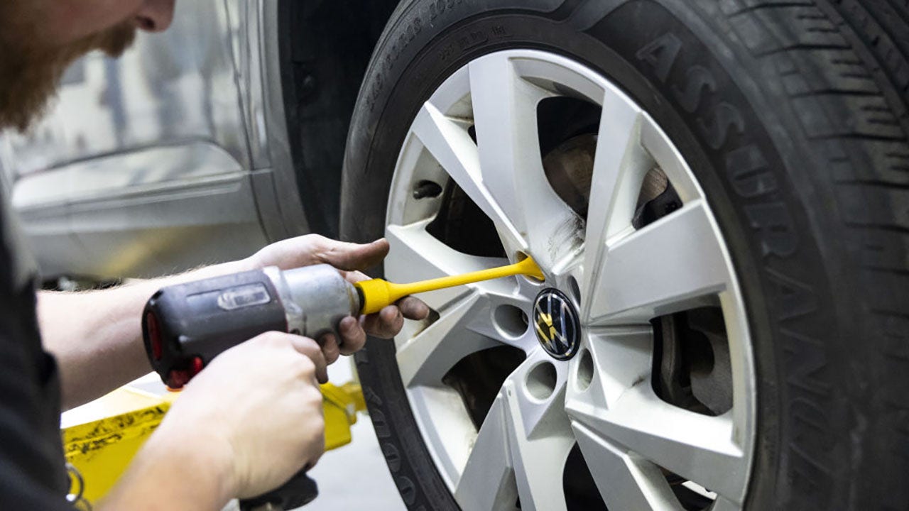 FILE - A worker uses an impact driver to change a tire at a CarMax dealership in Albany, New York, US, on Wednesday, Dec. 13, 2023. Photographer: Angus Mordant/Bloomberg via Getty Images