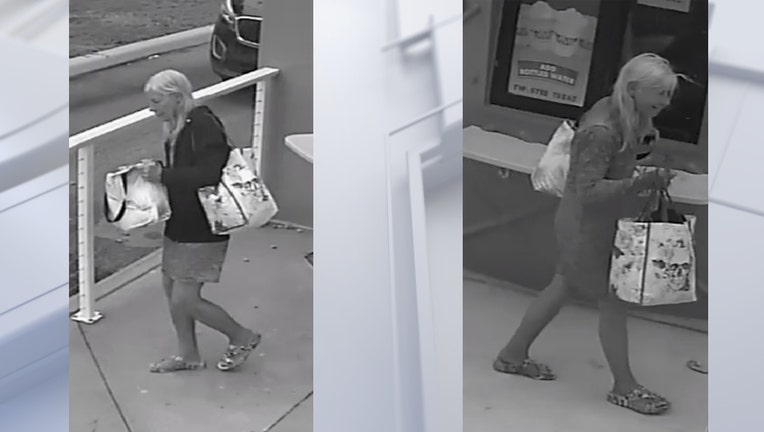 Investigators released surveillance photos showing the woman, describing her as having long blonde hair and a blue ring on her right middle finger.