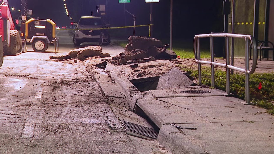 The force of the water left behind significant damage to the road, including a large hole where the break occurred. Road crews spent much of the following day making repairs.