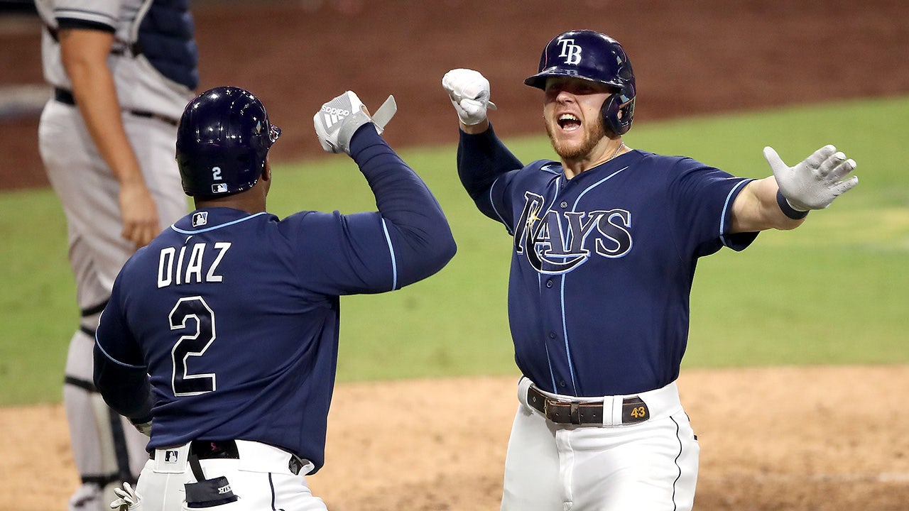 Michael Brosseau of the Tampa Bay Rays celebrates with Yandy Diaz after hitting a solo home run against the New York Yankees during the eighth inning in Game Five of the American League Division Series at PETCO Park on October 09, 2020 in San Diego,