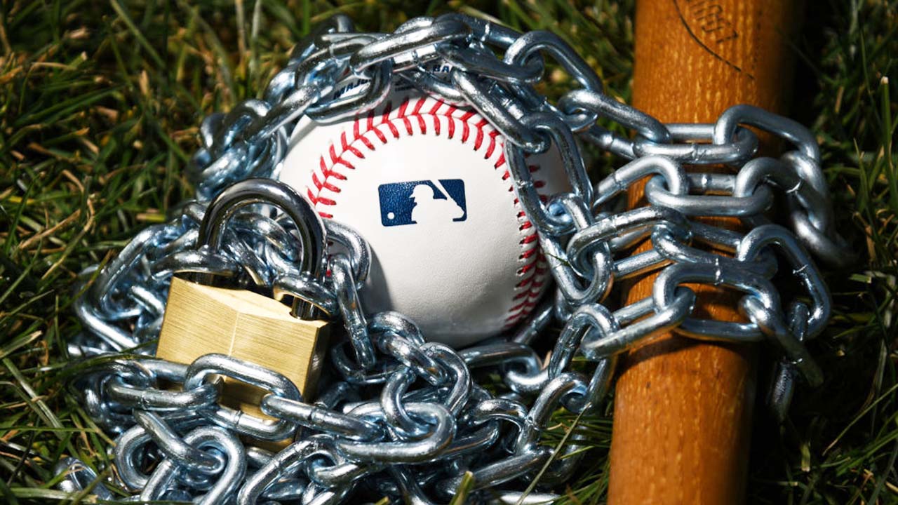FILE - An Official Rawlings Major League Baseball sits with a bat, lock and chain to represent the lockout between Major League Baseball (MLB) and the Major League Baseball Players Association (MLBPA) on Dec. 2, 2021.