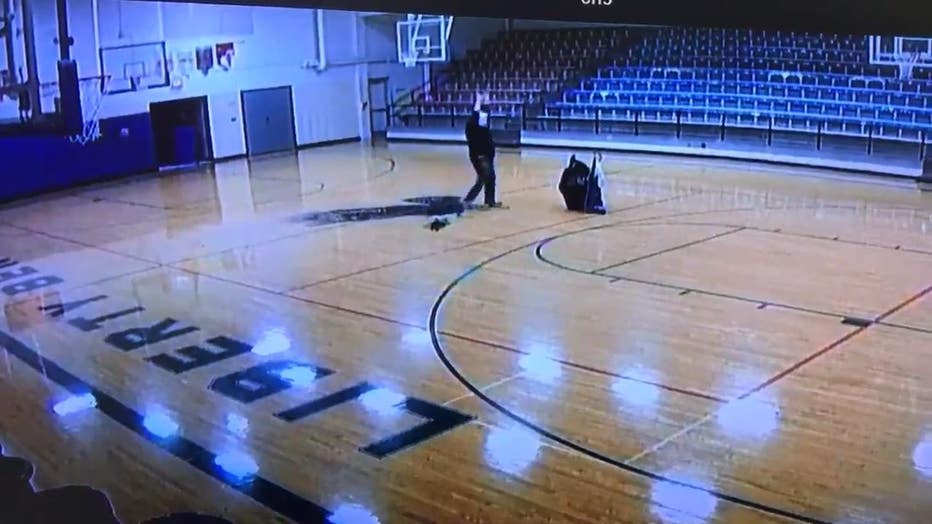 A security camera caught a middle school custodian making a backward half-court shot in an empty gymnasium on Thursday morning, February 4, before students and staff arrived for the day. (Credit: Principal Kyle Leatherman via Storyful)