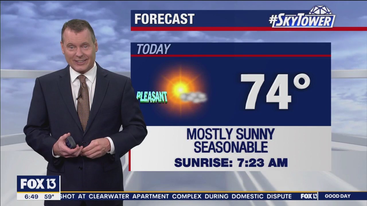 Meteorologist Dave Osterberg says Monday starts out a little foggy, with a tiny shower off north Pinellas County, but the day turns out warm with sun and highs in the mid 70s.