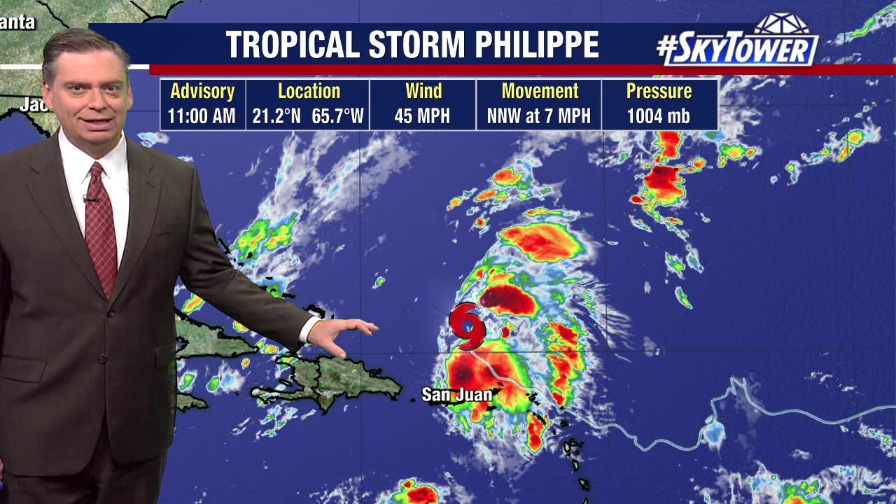 FOX 13 Meteorologist Jim Weber is still watching Tropical Storm Philippe, which is still holding its own. Weber says the storm has a ragged appearance due to wind shear. He says Philippe has made a turn to the north and will continue heading north-northwest. According to Weber, Philippe will attach to a cold front and lose some of its tropical characteristics. However, it should bring heavy rain to the New England area as we head into the weekend.