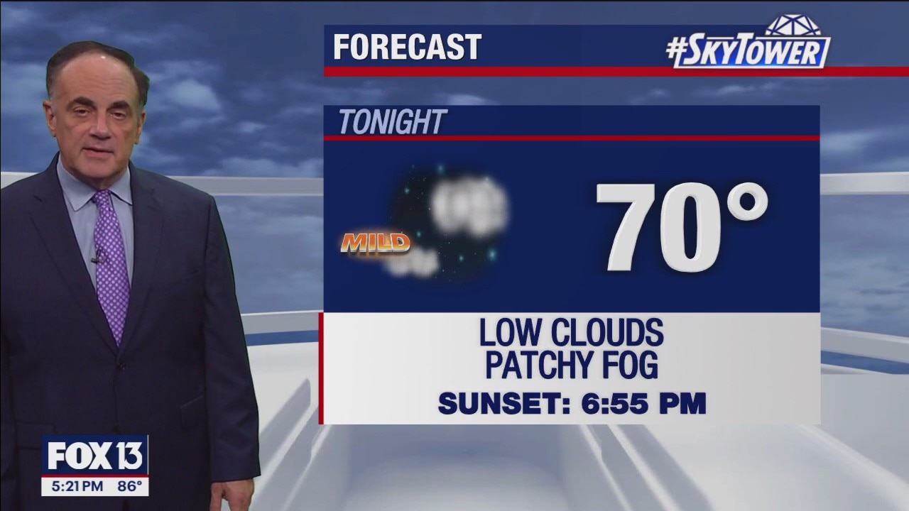 FOX 13 Chief Meteorologist Paul Dellegatto has the forecast for Tuesday night that includes low clouds and patchy fog.