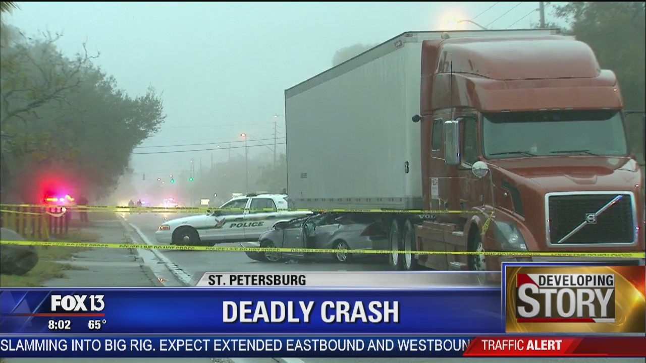 Vehicle lodged under semi