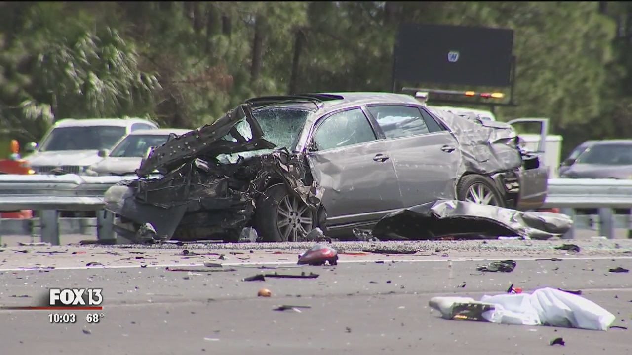 Troopers say a car rammed a car carrier at full speed. The debris from the crash caused five other crashes