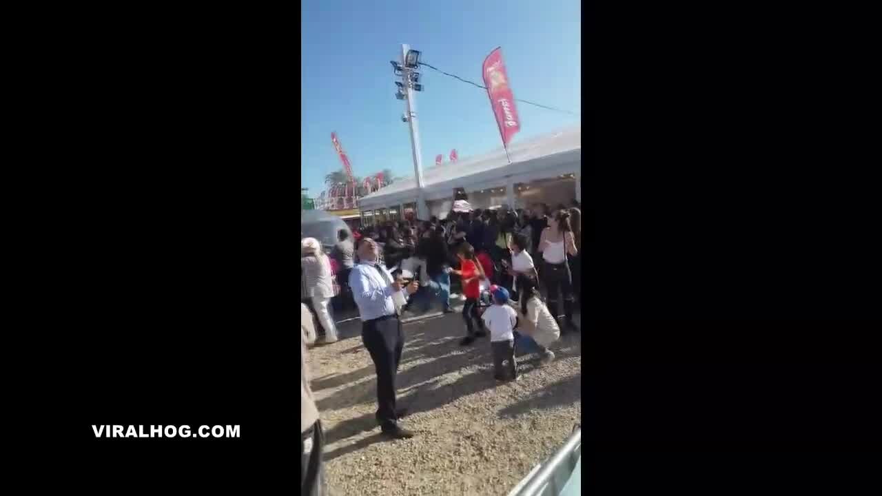 Terrifying video shows a woman falling from a ride and dangling by her feet at an event in France while people try to rescue her. VIDEO: Viralhog.com