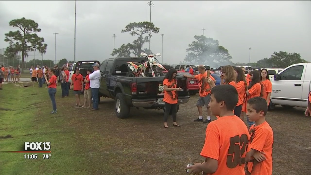 Friends did burn-outs and blared the horns of their lifted trucks as a way to remember 16-year-old Matthew Batchie. The teen died days after being hit by a car on Siesta Drive in Sarasota.