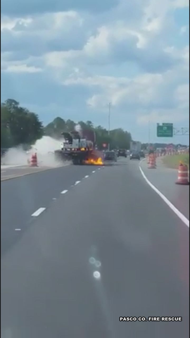 Video released by Pasco County Fire Rescue shows the moment a large commercial vehicle explodes into a ball of fire and black smoke on Interstate 75 Friday evening.