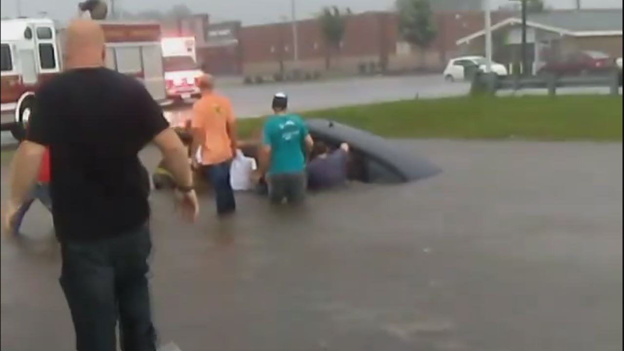 A group of bystanders formed a human chain to rescue a woman from her sinking car Friday afternoon. Kaycee B. Karcher recorded on her phone as her husband, Scott joined several others in the flooded parking lot of a Chick-fil-A.