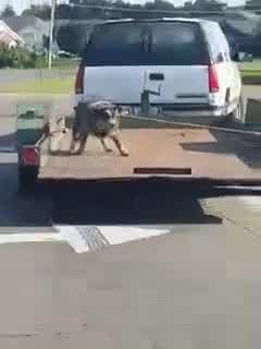 Dog tethered to trailer pulled by SUV